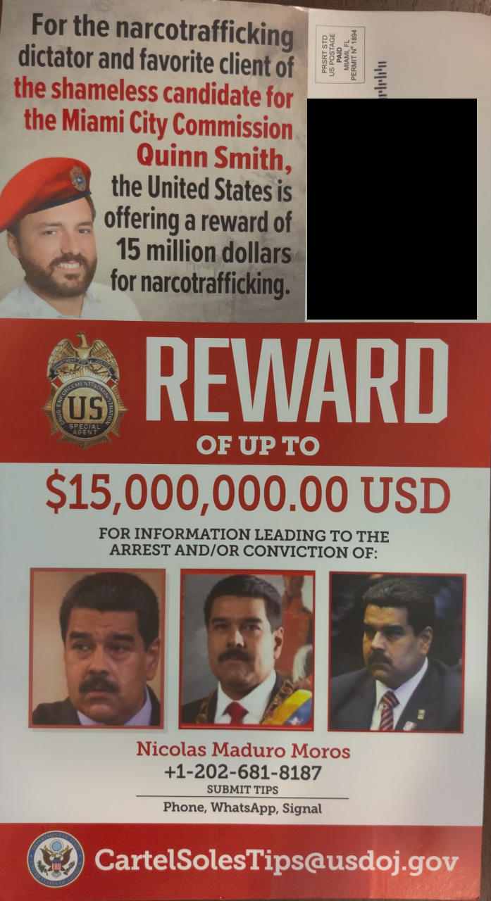 “Quinn Smith has his hands stained with blood from the dirty money that the Chavista dictatorship has paid him,” one mailer stated. “Candidate Quinn Smith has been hired as an attorney to defend the narcotrafficking Venezuelan dictatorship, while they murder, abuse and incarcerate thousands of young Venezuelans.”