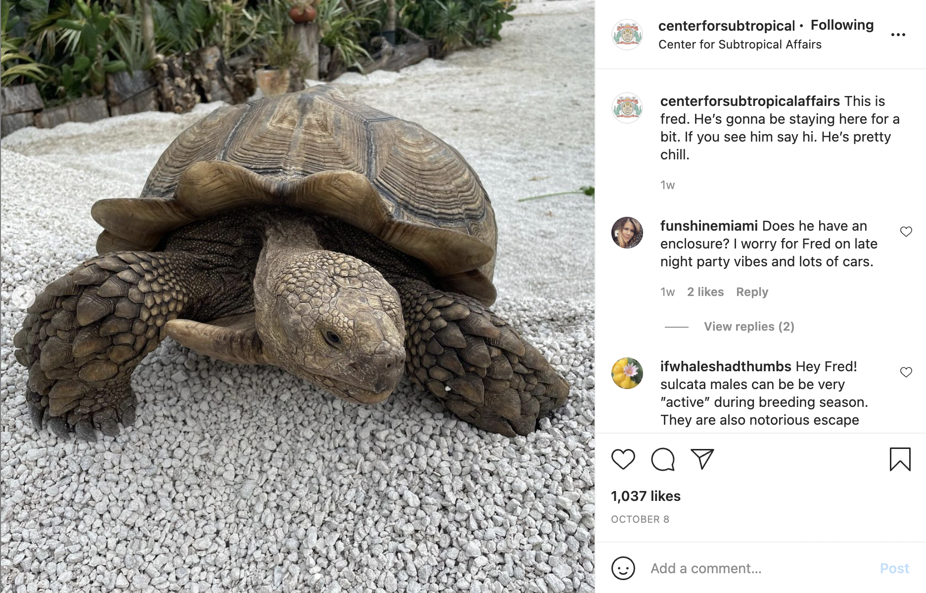 “I will never get over the image of a giant tortoise walking up Miami Avenue,” reads an October 8 post by the Center for Subtropical Affairs. “In retrospect I think he was looking for his dad!”