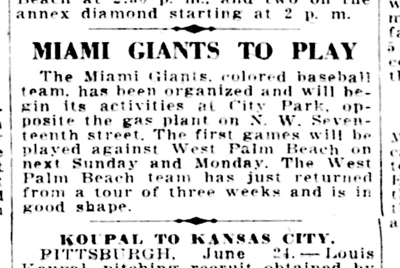 The Giants were formed and “financed in the late 1920s by a local black bootlegger and numbers king, Johnny Pierce,” according to Raymond Mohl’s 2002 article in Tequesta, the literary journal published by HistoryMiami. Little else is written about Pierce, who died in 1937 shortly after renaming the team the Ethiopian Clowns.