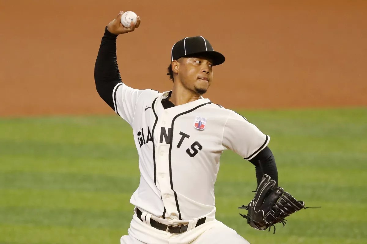 Marlins pitcher Elieser Hernandez wears a uniform commemorating Miami's Negro Leagues team, the Giants, at Marlins Park on Sunday.