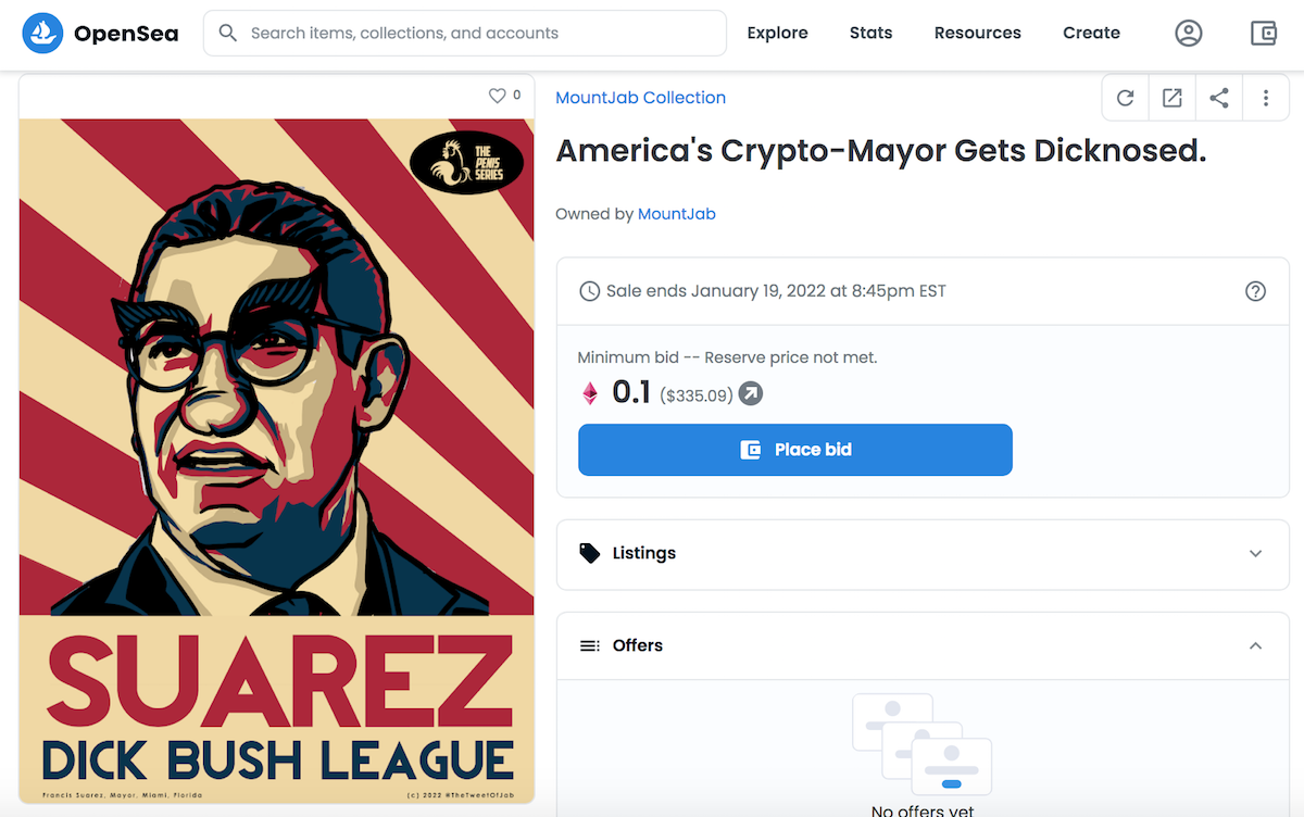 The minimum bid is 0.1 Wrapped Ethereum (WETH), or roughly $335. Bidding closes next Wednesday, January 19. Stevens hopes the mayor will buy the NFT as part of his push to bring tech talent to Miami.