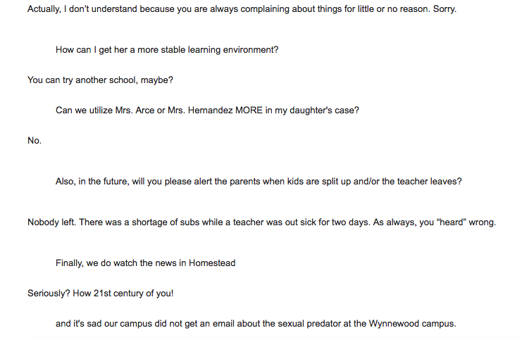 Incredulous, she shared the email on social media and contacted the charter school’s board to complain. By Wednesday afternoon, de la Rosa had emailed parents a statement about the exchange, saying that “new communication channels” are being put in place to ensure future conversations are respectful.