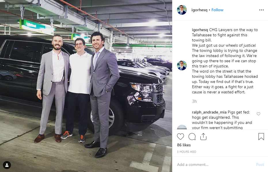 Just yesterday, Hernandez posted an image on Instagram with his colleagues as they prepared to drive to Tallahassee to speak against the law. In response, Ralph Andrade, a longtime lawyer for Beach Towing, posted a comment on Hernandez’s photo. (Andrade did not immediately respond to a message from New Times last night.)