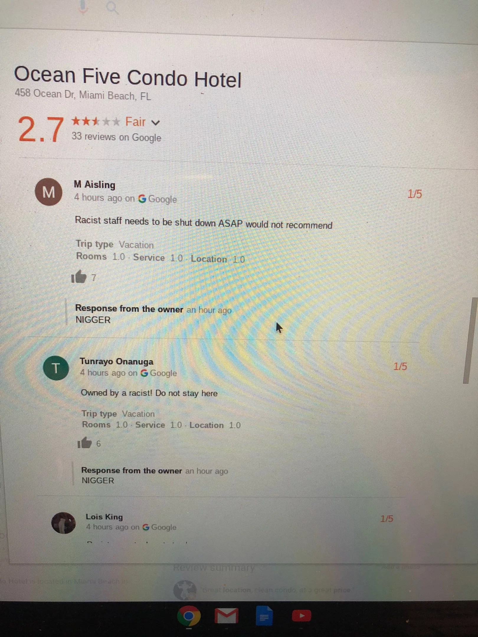 In a phone conversation with New Times, Ozyesilpinar defended herself by claiming Brown insulted her first, though the screenshots don’t reflect that, and Brown denies it. As the condo owner’s messages to Brown spread across social media and people left Google reviews calling her racist, a person listed as the owner of Ocean Five Condo Hotel responded with the word “NIGGER.” Those comments had vanished by Monday afternoon, after New Times spoke with Ozyesilpinar. In an earlier comment that remained online, the owner responded to a person who accused her of racial profiling by saying, “We don’t like Monkeys like you with stupid questions.”