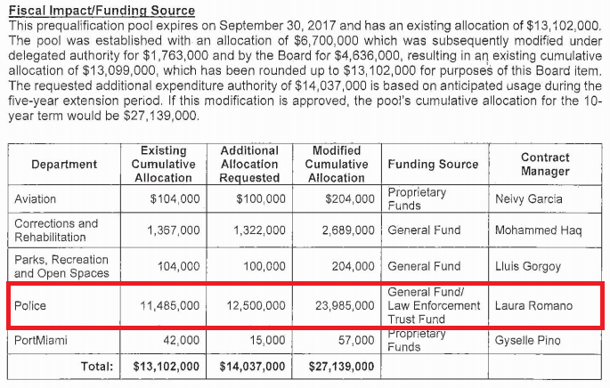 “As of this date, a majority of these funds have been disbursed for purchases, and our Fiscal Administration Bureau has pending purchases that are projected to consume the balance by the end of the contract term on September 30, 2017,” MDPD spokesperson Alvaro Zabaleta said Friday via email.