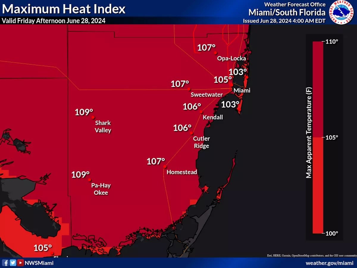 While heat advisories were previously issued when the heat index reached 108 degrees for more than two hours in Miami-Dade and Broward, the NWS now issues a heat advisory if the index reaches 105 degrees for two hours in those counties. Other areas in the NWS Miami forecast zone remain under the old criteria.