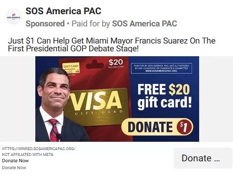 “Everything costs more in Joe Biden’s America so, to help you out, Miami Mayor Francis Suarez is offering you a free $20 Visa gift card when you donate just one dollar to his campaign,” the promotion reads.