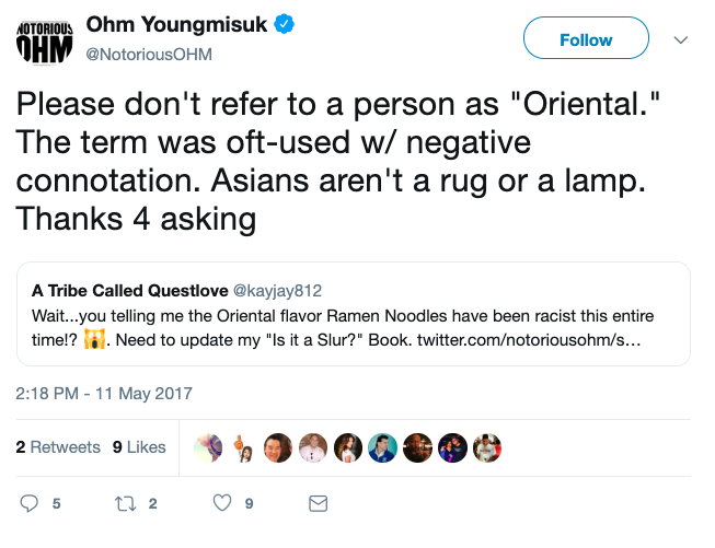 “Once you realize this word is at best antiquated, and at worst interpreted as bigoted, why would you keep using it when Asian American is an accepted neutral alternative?” he told the paper. “It’s no different from the change from ‘Negro’ to ‘African-American.’ If someone today says ‘Negro,’ you do a double take.”