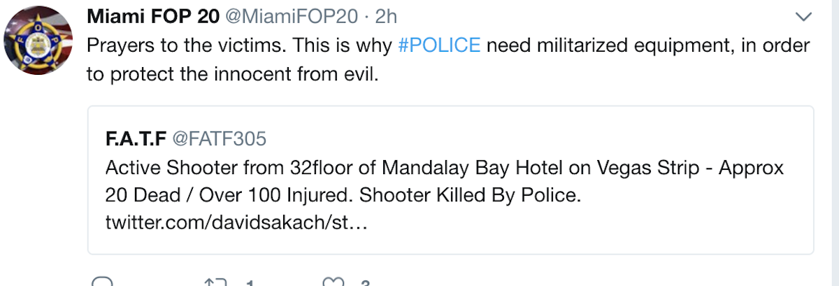 Lt. Javier Ortiz, the head of Miami’s Fraternal Order of Police, took to Twitter at 6:30 a.m. to bang out a post linking images of Vegas cops responding to the shooting to NFL players taking a knee during the anthem at a recent game: