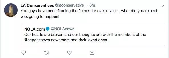 Just hours after a gunman had murdered five journalists and their coworkers at the Capital Gazette, the Times-Picayune shared messages of support for the Maryland paper – and LA Conservatives replied, “You guys have been flaming the flames for over a year… what did you expect was going to happen!”