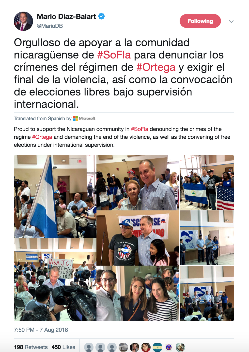 “Proud to support the Nicaraguan community in #SoFla denouncing the crimes of the #Ortega regime and demanding the end of the violence, as well as the convening of free elections under international supervision,” the congressman tweeted Tuesday in Spanish.