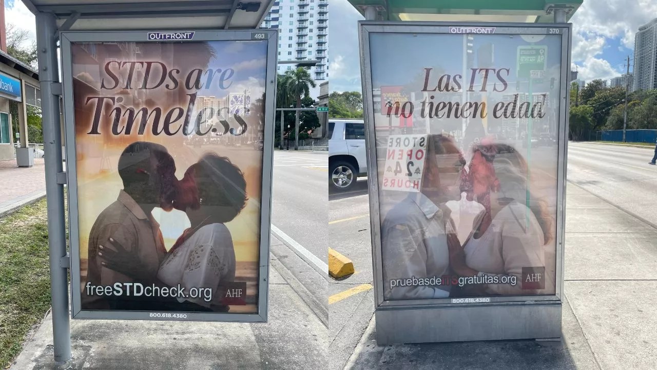 Side-by-side images of the “STDs Are Timeless” ad campaign seen on bus stops in Miami. The ad on the left is located at 19th Street and Biscayne Boulevard, while the ad on the right is at 19th Street and Second Avenue.