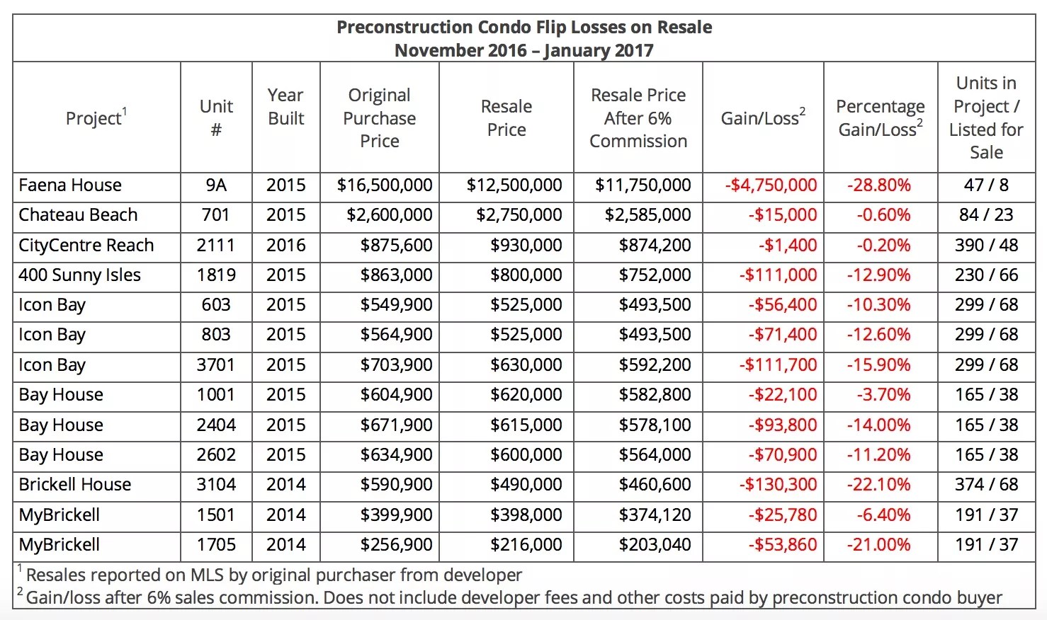 and 2018, Miami condo flippers should expect losses on resale to continue,” Stearns writes.