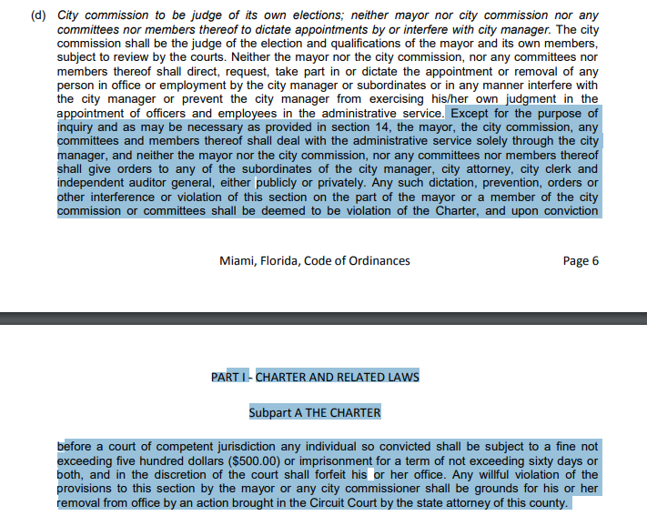 As local blogger Al Crespo first reported, the citywide “bulletin” referenced the exact city charter section, 4(d), which warns commissioners they can be removed from office and even jailed for interfering with the city manager’s employees.