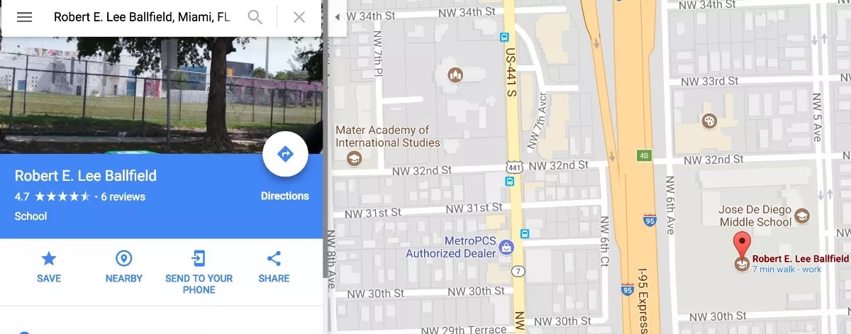 The ballpark next to the school, though, seems to have never quite lost its tie to the Confederate general. Miami Herald sports stories continued referring to it as Robert E. Lee Park well into the late ’90s, and Google’s mapping system apparently picked up on the name as well.