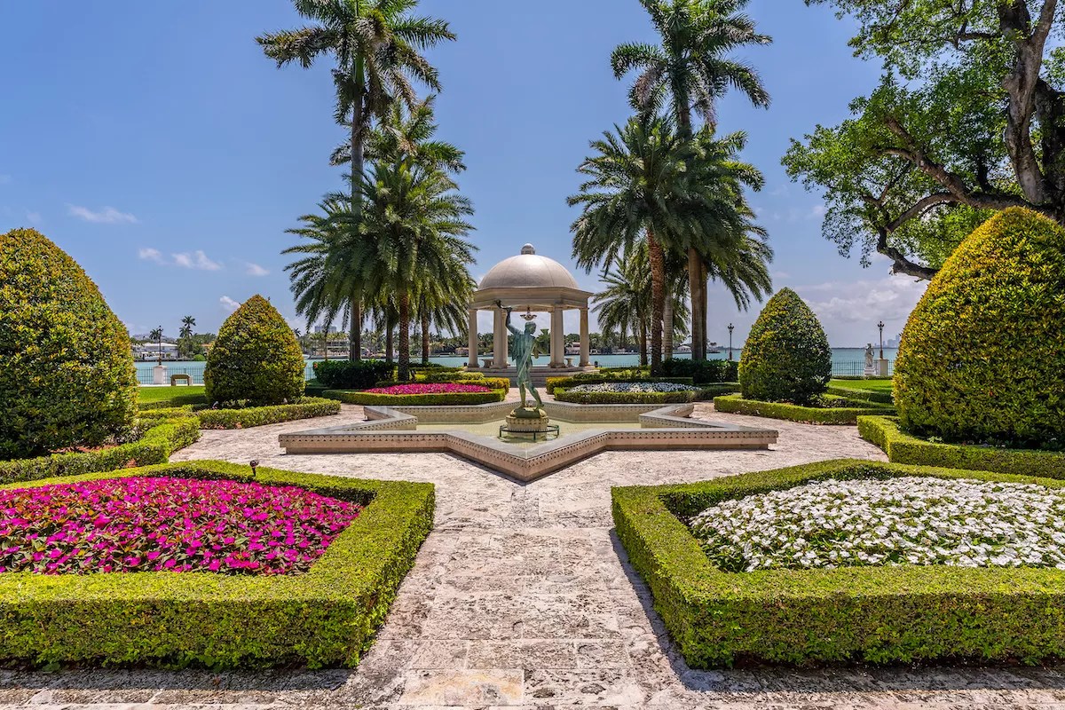 The nearly three-acre property boasts statues of Greek gods and goddesses, opulent marble floors, handpainted frescos on the ceiling, crystal chandeliers, an extravagant Spanish-style courtyard, and 600 feet of frontage on Biscayne Bay with panoramic views of the Miami skyline. Not to mention a wine cellar, a vintage movie theater, and a private waterfront park on the property called “Domaine de la Paix et de l’Amour” (French for “Domain of Peace and Love”), decked out with manicured greenery and a waterfront gazebo.