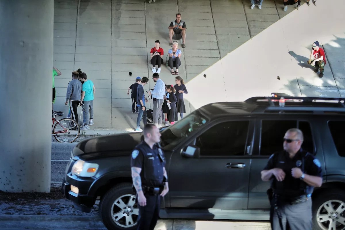 Parents wait to hear from their children underneath the overpass. See more photos from the response effort here.