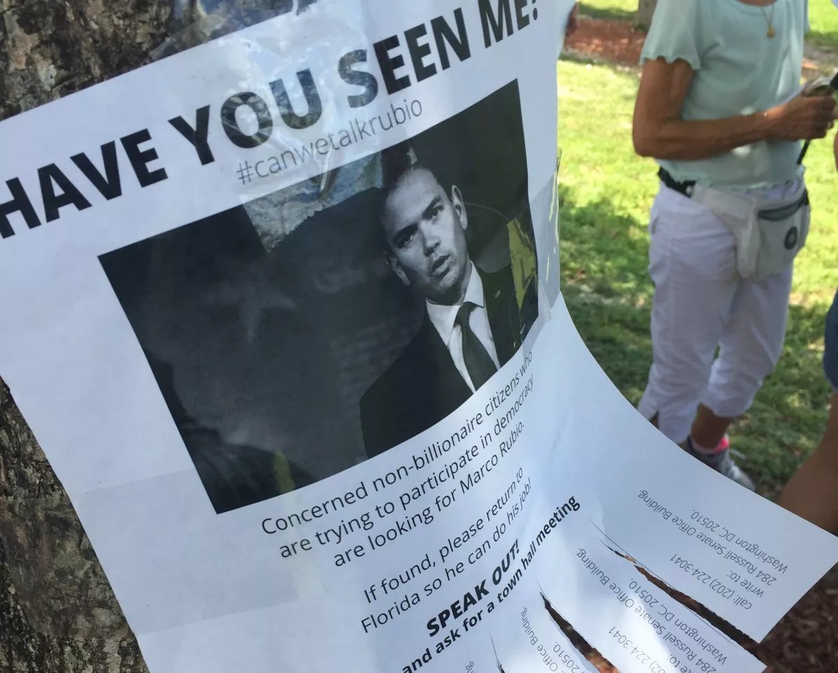 “[Rubio] has an obligation to his residents, not his donors,” protest organizer Laurie Woodward Garcia said, shaking her head as a line of police officers on standby blocked the entrance. “We’re asking for a town hall, but he’s neglecting his obligation to communicate with Floridians.”