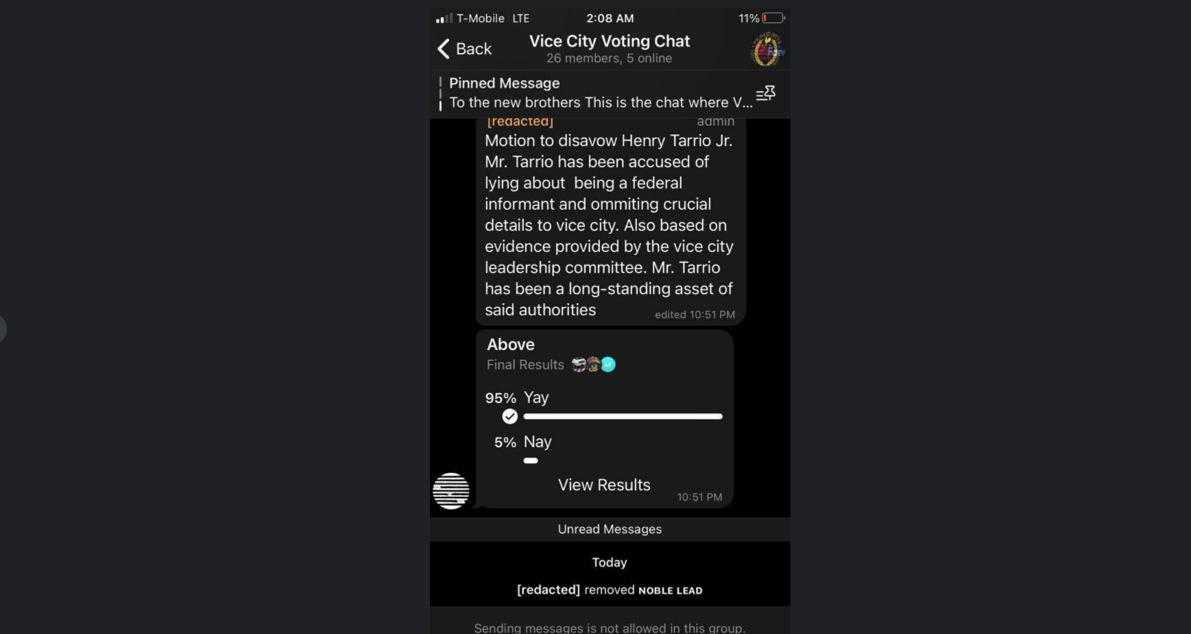 A screenshot of the poll showed that 95 percent of the group had voted to remove Tarrio from the Vice City chapter, but the poll was taken down after the screenshot leaked. According to Tarrio, members opted instead for an in-person vote, where they voted not to remove him.