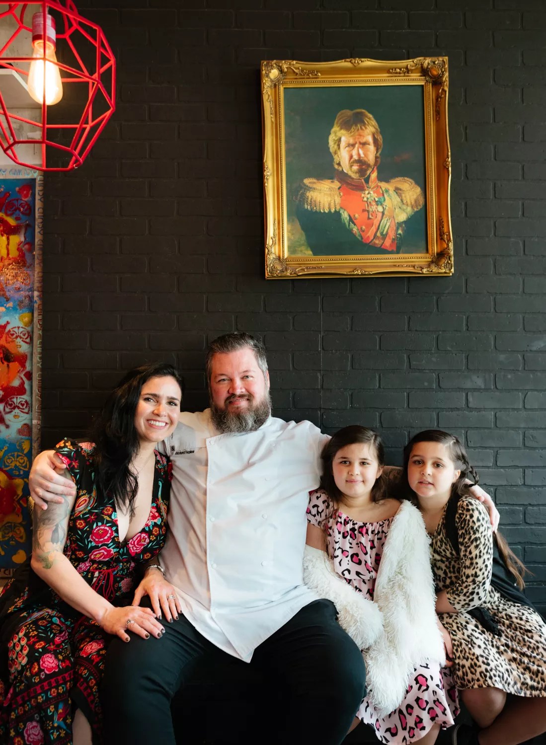 “Sometimes I think about it all and am like, Fuck, but then I look at my life and I have Jenny, I have my kids, I have successful businesses, I have nothing to complain about,” he says while sitting at his fast-casual spot, Sakaya Kitchen, and working through a Korean hot dog ($8) topped with tater tots, house mustard, and kimchee slaw.