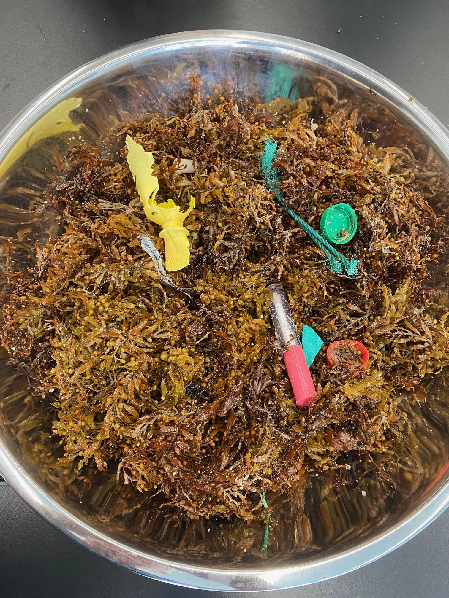 “The really teeny tiny bits can even get incorporated into the tissues of the sargassum,” Anderson says. “It kind of becomes one with the tissue.”
