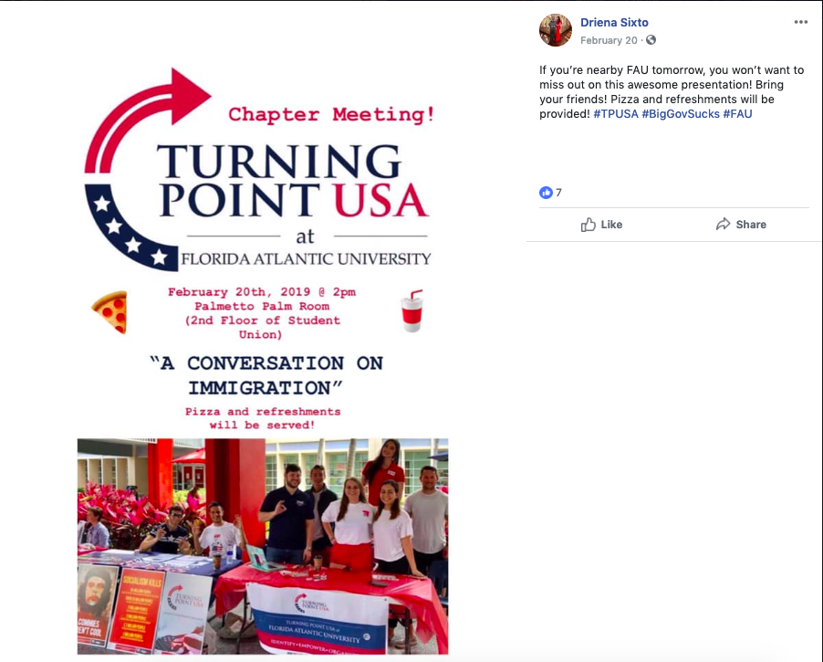 Nova Southeastern University’s TPUSA chapter might not be the only TPUSA breeding ground for the fringe right in South Florida. A photo shared by the group’s regional director for Florida and the South, Driena Sixto, just last week shows three students in Florida Atlantic University’s TPUSA chapter flashing the “OK” hand signal favored by Proud Boys and other members of the online alt-right.