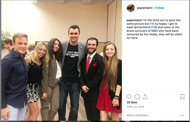 Perez’s public Facebook posts illustrate the concern many observers have raised about TPUSA’s pipeline to the alt-right. Before moving to Florida for college, Perez mainly posted about videogames and shared photos of himself playing music. He began college in fall 2017 and started posting some memes not long thereafter. By April 2018, he had shared a photo of himself with Charlie Kirk, who founded TPUSA, on Instagram.