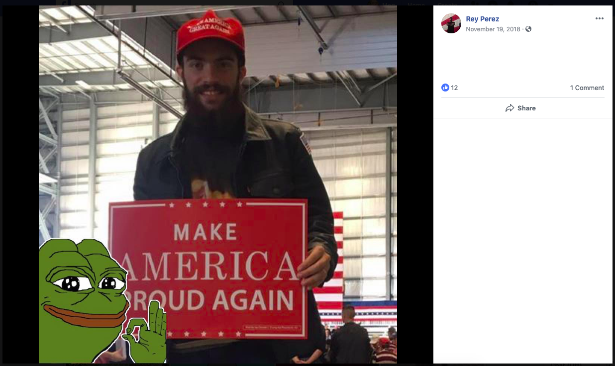 The following month, on November 19, Perez shared a photo of himself holding a sign that read, “Make America Proud Again,” on Facebook. An image of Pepe the Frog, a cartoon meme popular among the alt-right, had been added to the bottom left corner of the photo.
