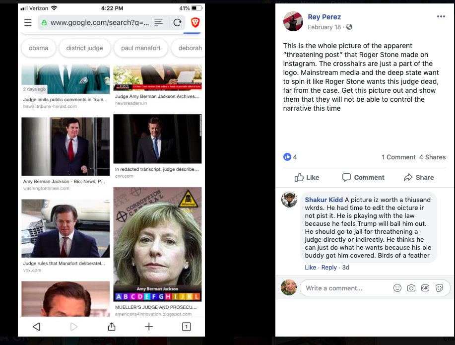 The same day the photo was posted, Perez shared a screenshot of the Google image search that leads to the photo on his own Facebook page and wrote, “Mainstream media and the deep state want to spin it like Roger Stone wants this judge dead.”