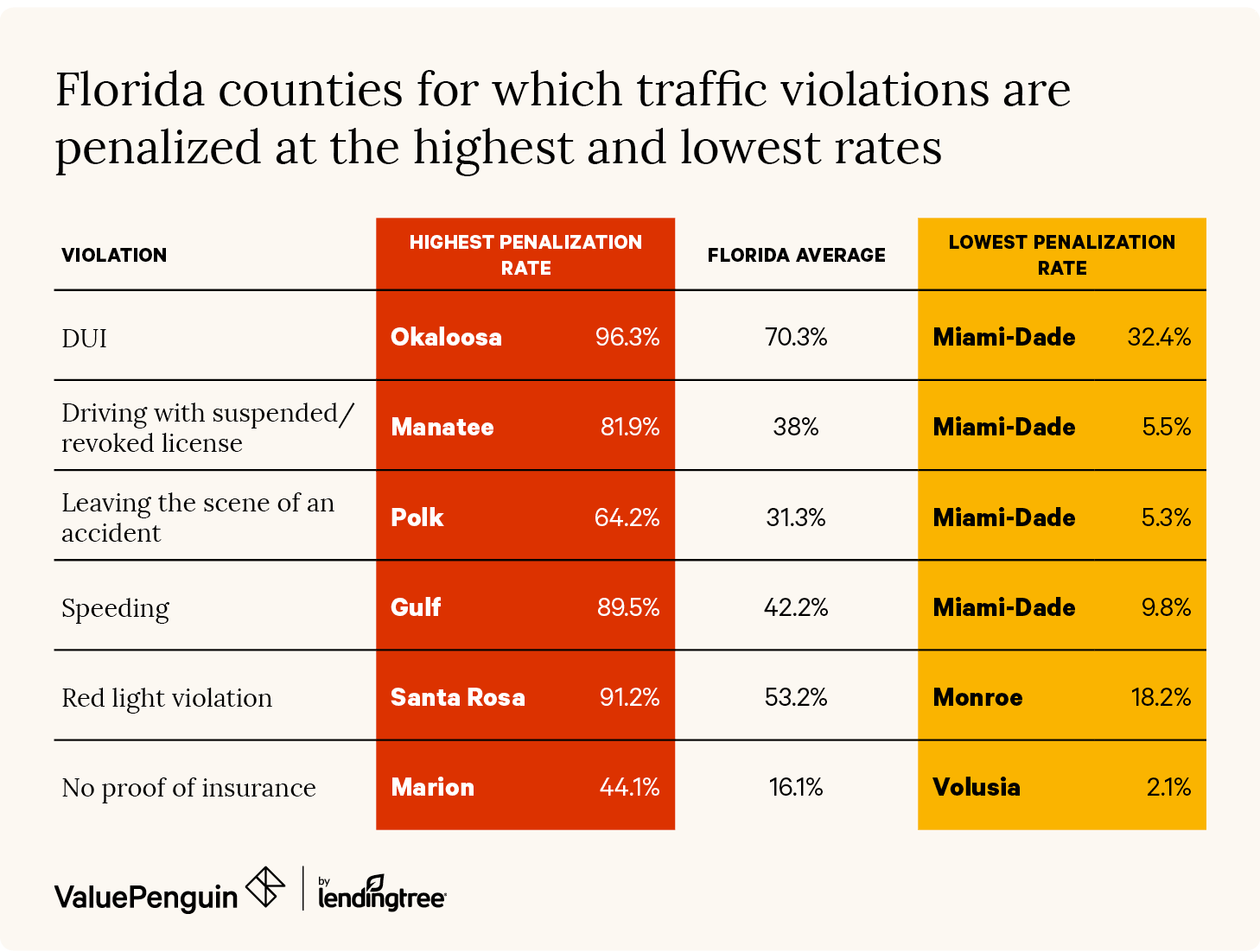 In a study released by the personal finance company ValuePenguin, researcher Mark Fitzpatrick crunched the state data and found Miami-Dade had the lowest rate of penalizations in Florida for a variety of traffic offenses, including DUI, leaving the scene of an accident, and driving with a suspended or revoked license.