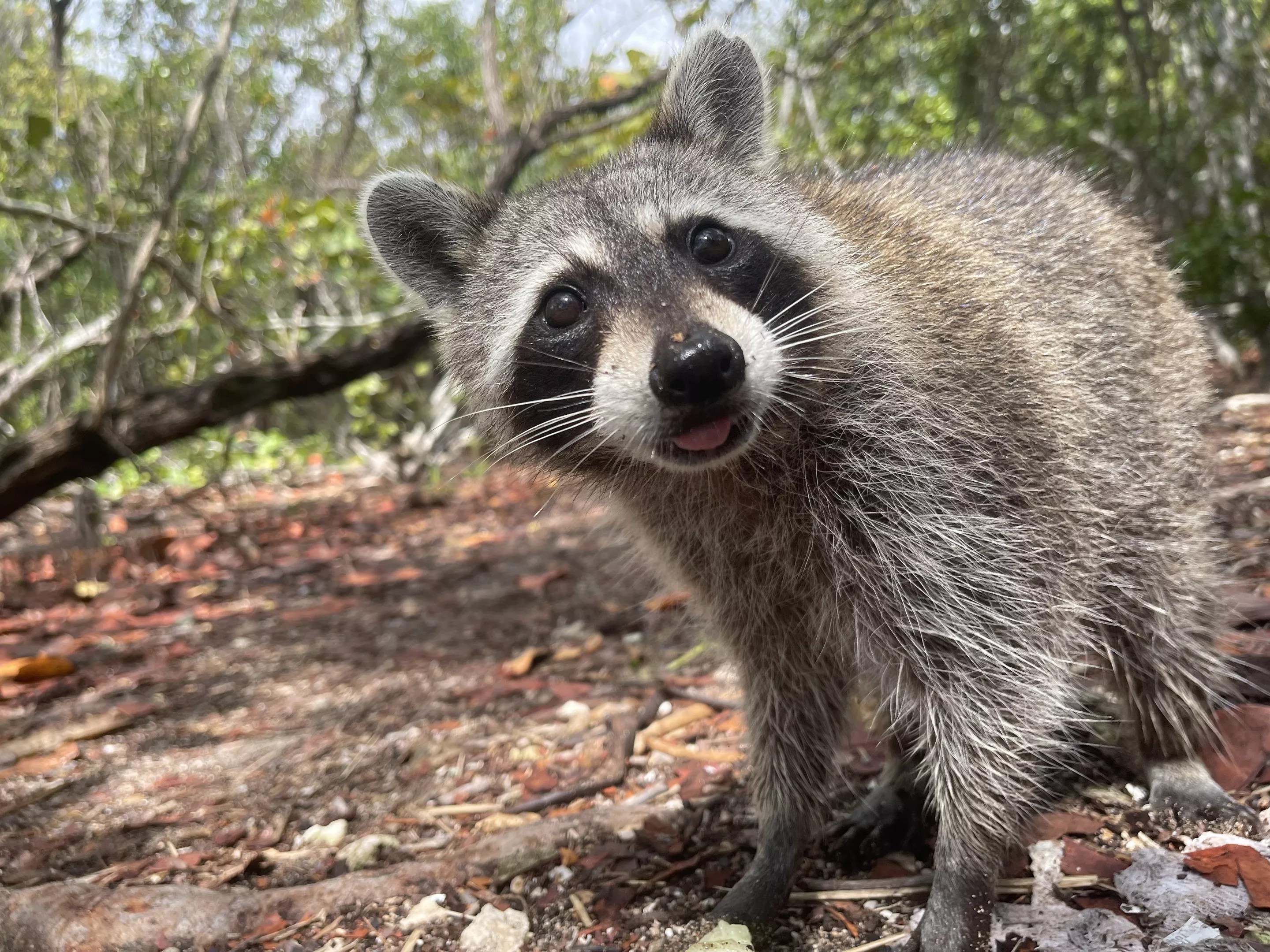 A polite raccoon stares at the camera on Raccoon Island. The island stars aren’t camera-shy.