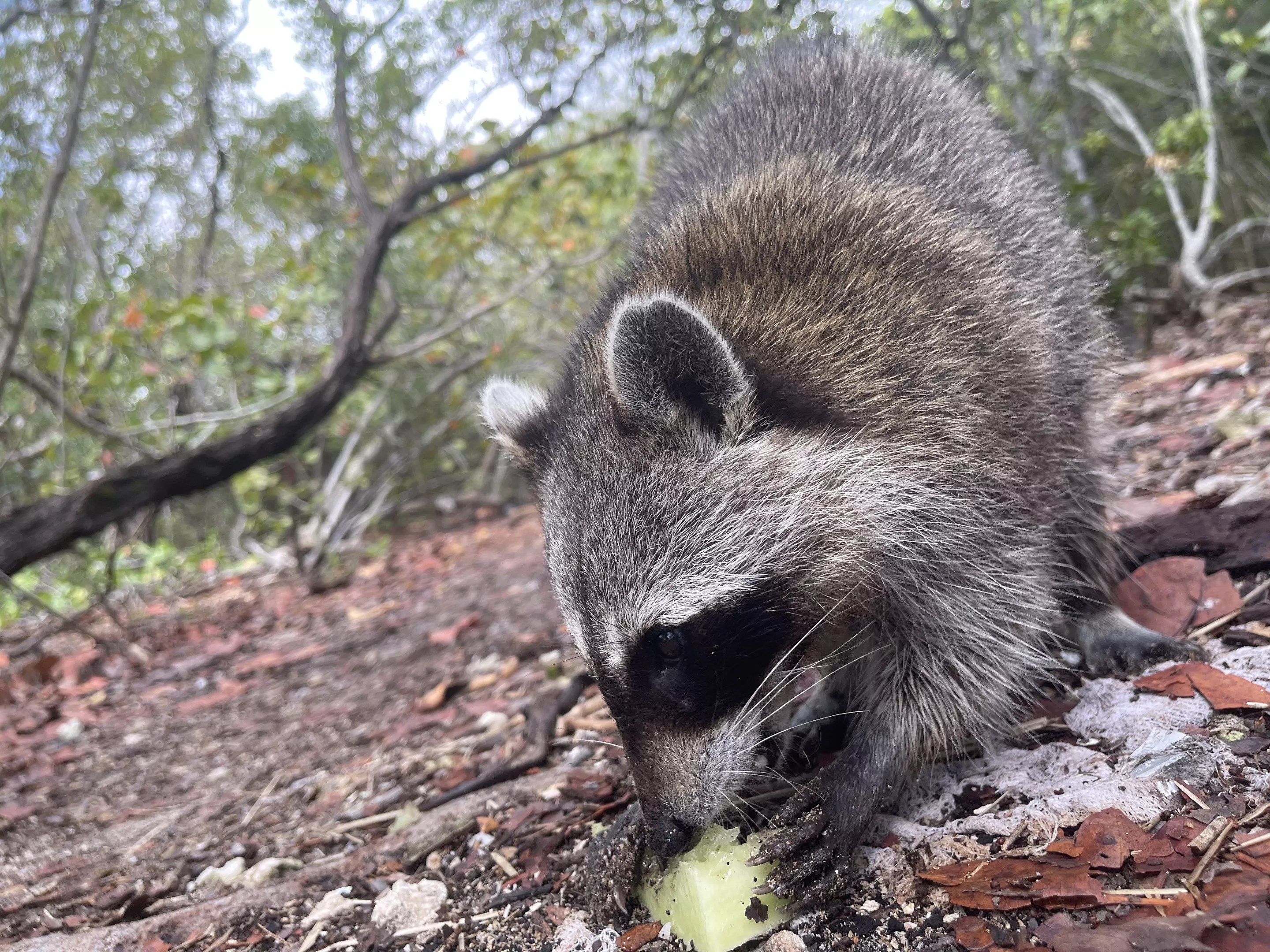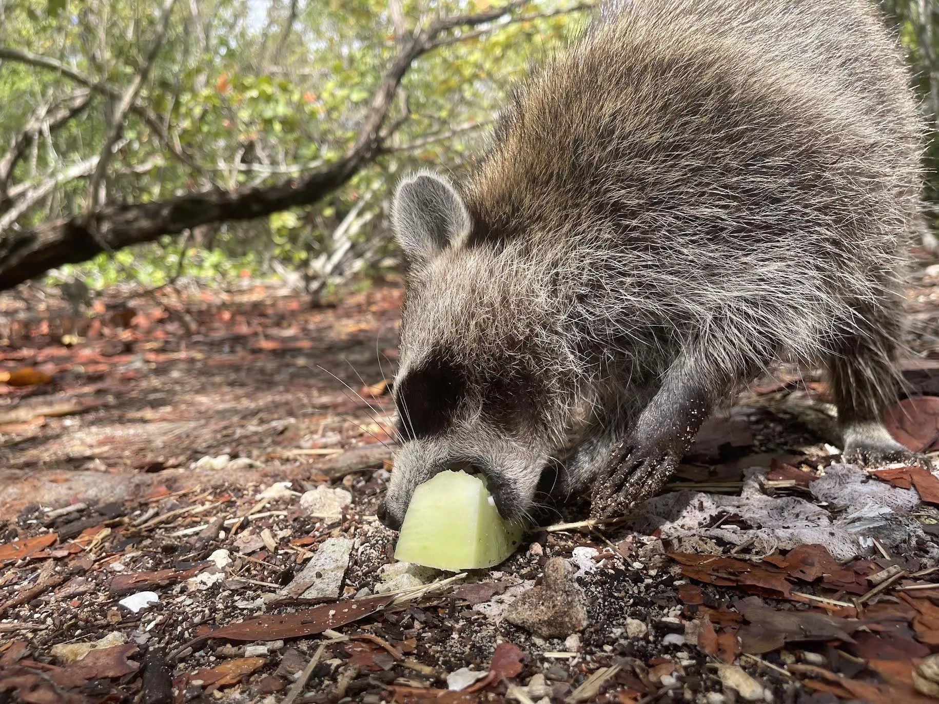 A raccoon snacks on honeydew melon on Raccoon Island.