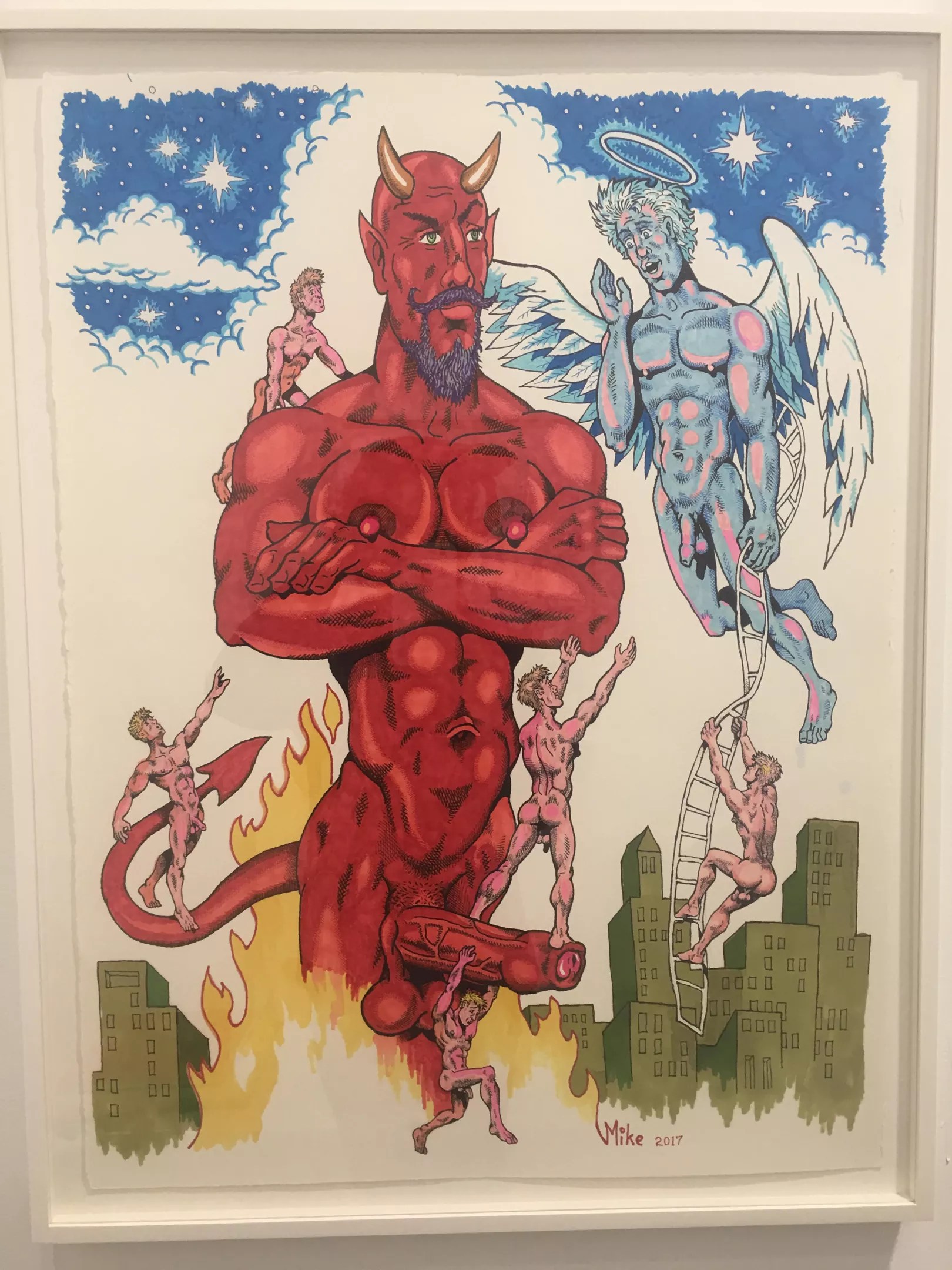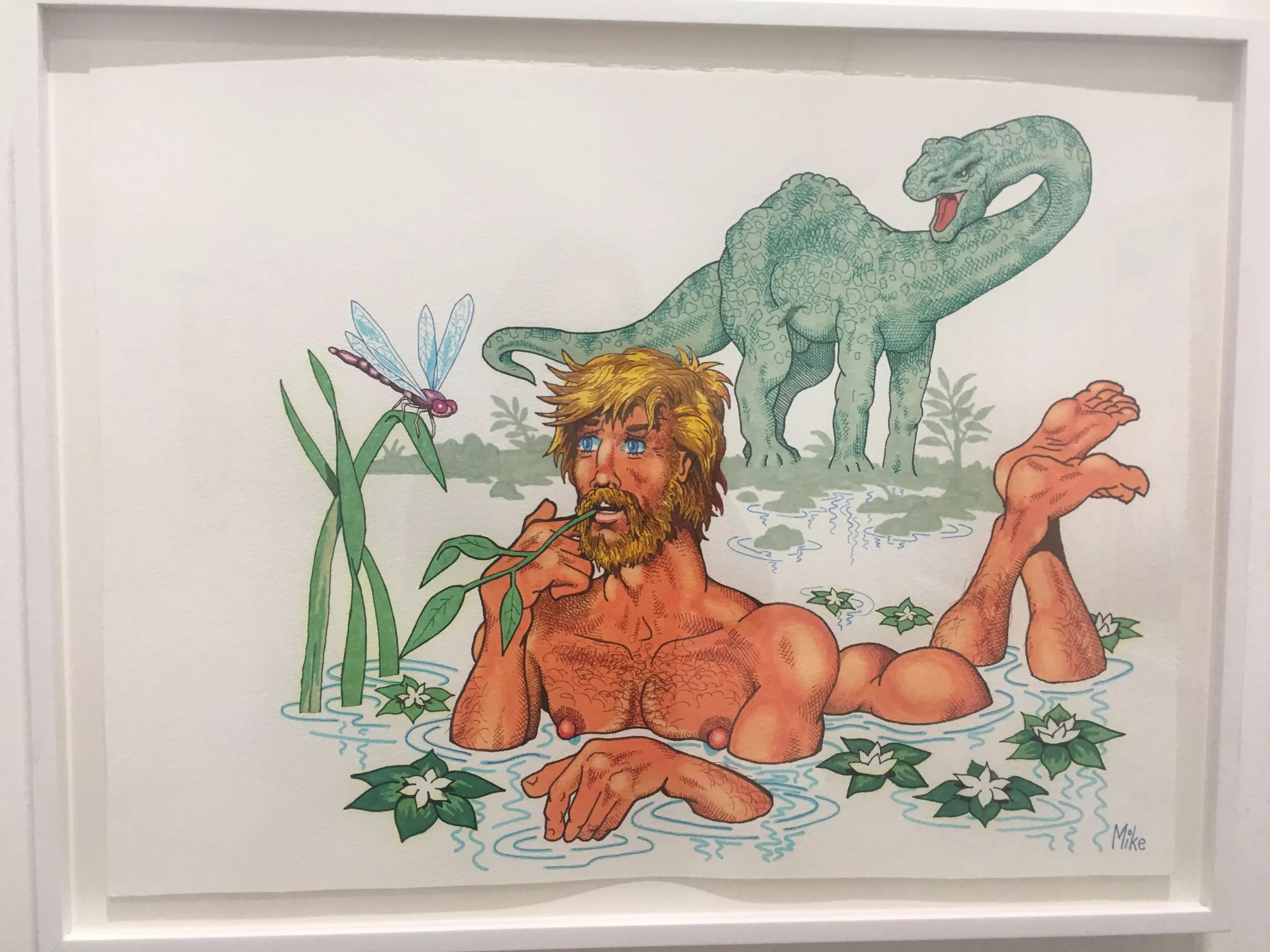 These drawings come from erotic art legend and filmmaker Mike Kuchar, a compatriot of famous cartoonists R. Crumb and Art Spiegelman. His work is wonderful. But this collection also includes a dinosaur ogling a virile man’s butt, a sketching of Satan with a gigantic erection, and one massive fuck-cyclops, so we’re including them: