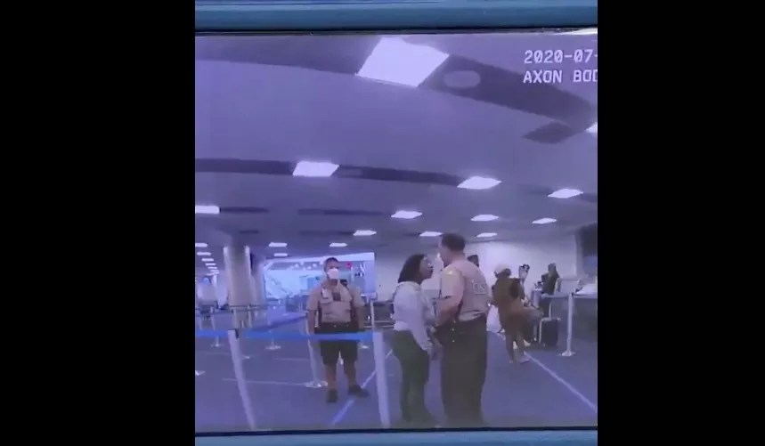 Miami documentarian Billy Corben posted the video on Twitter. It appears to show body-worn camera footage viewed on a phone or camera screen. The woman can be heard talking, then arguing, with two officers in the airport terminal. Some of what the officers say is difficult to make out, possibly because both are wearing facemasks, but one of the officers seems to egg the woman on and say, “Punch him.” The woman, who is not wearing a facemask, clearly responds, “I really should.”