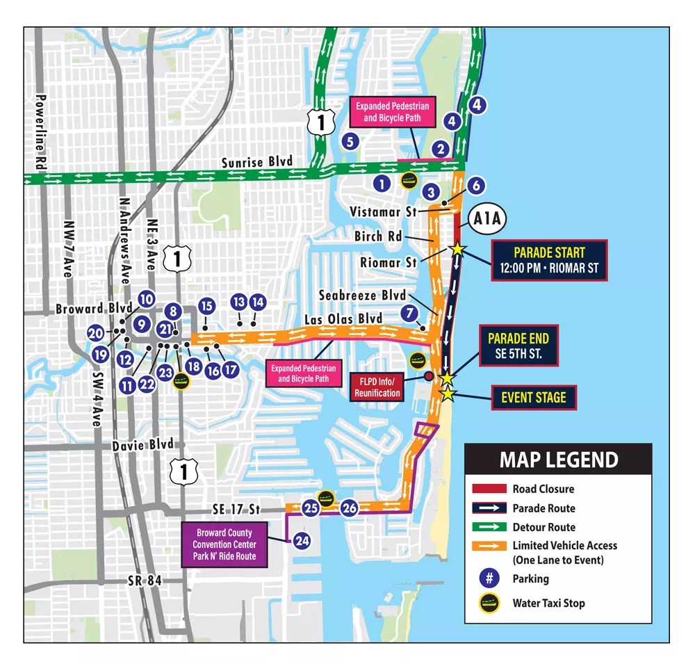 The city advises downtown visitors to expect limited parking and long walks to the event site. To get closer, officials recommend using the water taxi or ride-share services. Broward County Transit will offer continuous loop service to the event site from 8 a.m. to noon, and then back to parking facilities between 2 and 4:30 p.m.