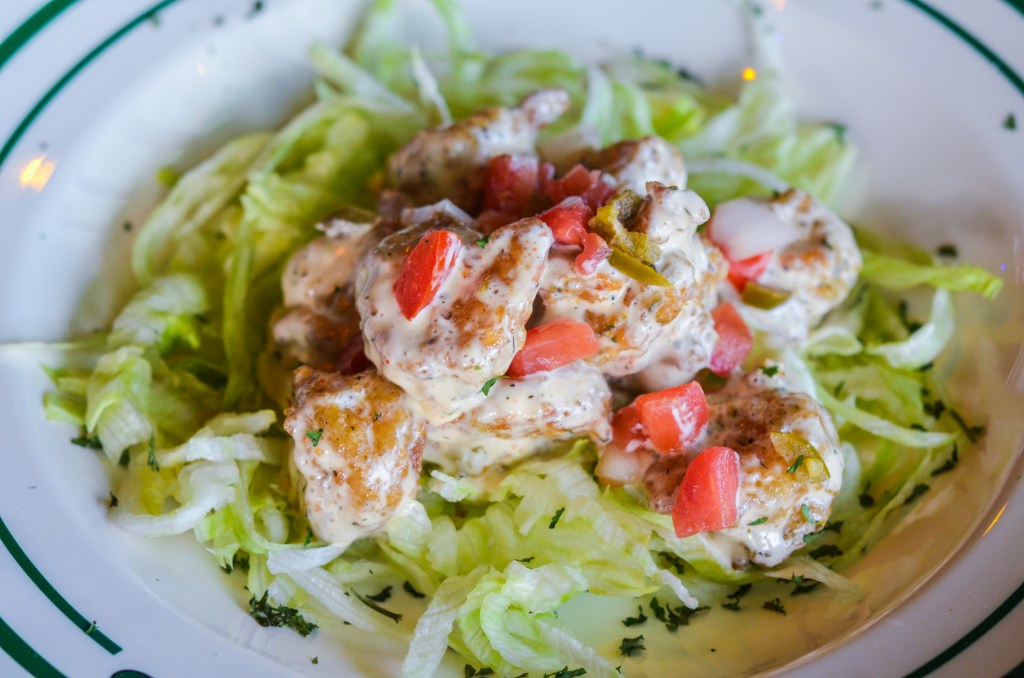 Another “trademarker,” these plump, deep-fried shrimp are perfectly tossed in a ridiculously delicious, slightly spicy cream sauce before being nestled over a bed of iceberg lettuce and topped with pico de gallo. Not ordering the “Firecracker Shrimp” for the table is sacrilegious.