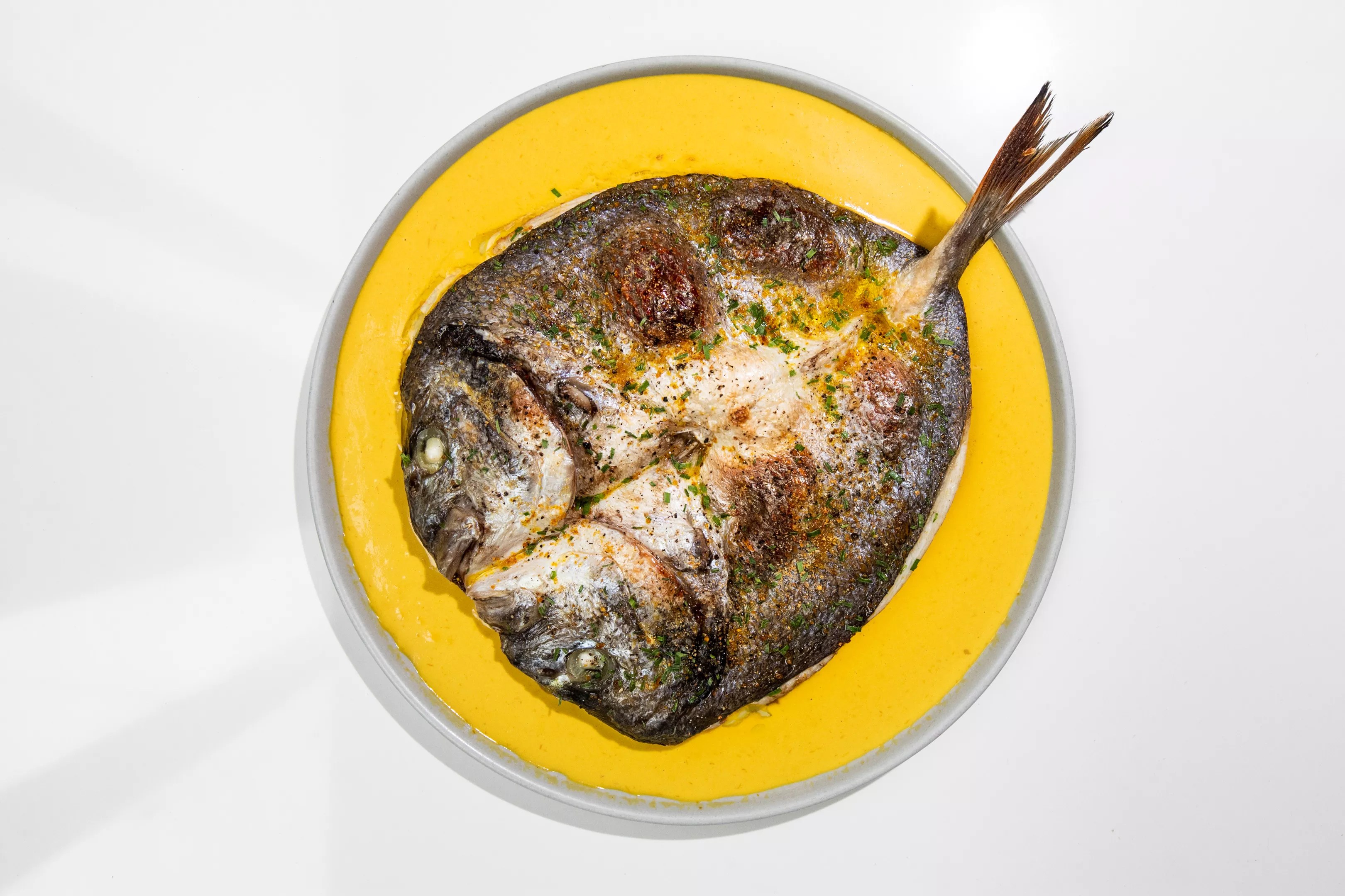 Whole-roasted dorade is a meaty white-fleshed fish dish that’s paired with a rich aji amarillo beurre blanc.