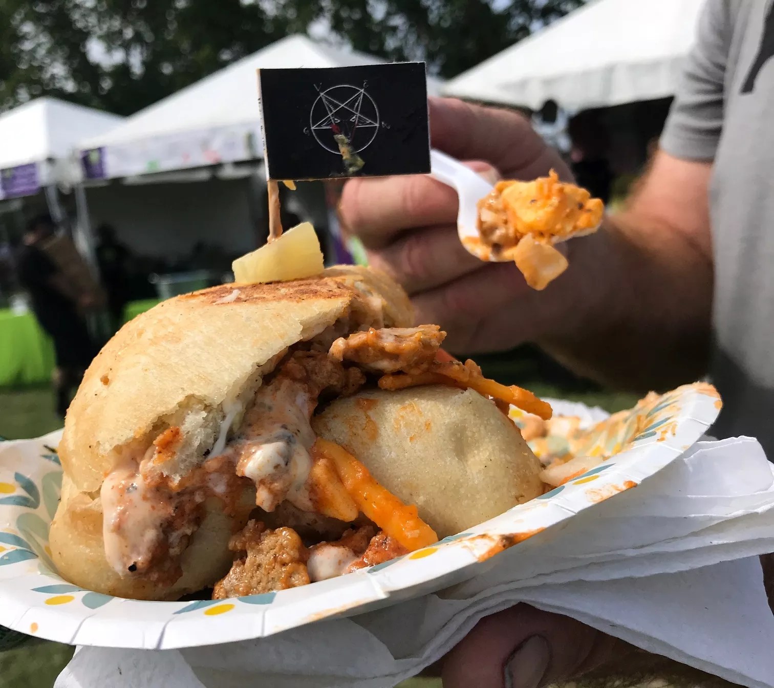 Other standouts included a Buffalo “chicken” sandwich from Portland’s Snackriledge. The eatery’s shirts, printed with a pentagram logo that spelled out “vegan” at each point, were as popular as the food.