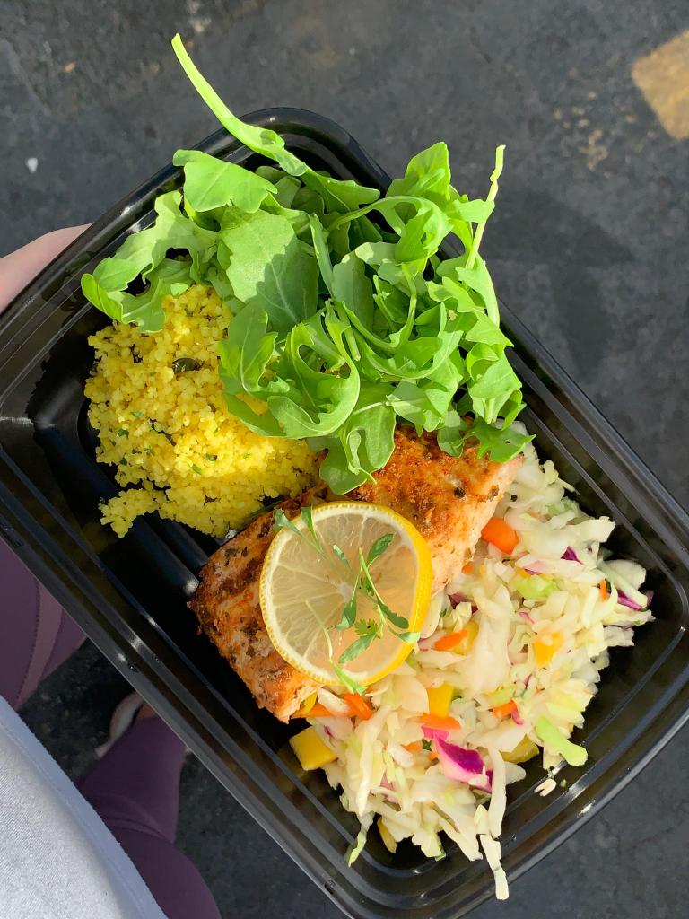 This salmon and fresh salad meal showcases the balanced plates central to Jet Fuel’s nutrition philosophy.